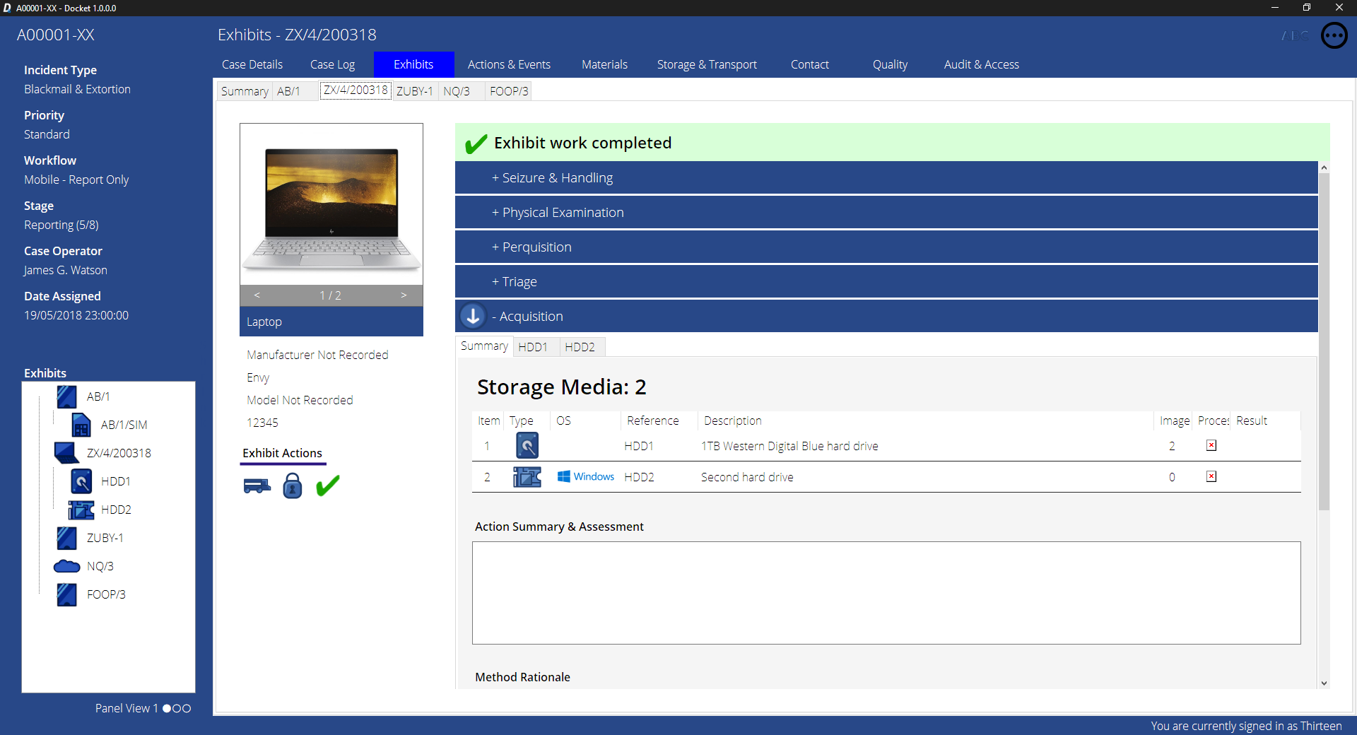 Many features can’t be seen or explored by image alone, and I’ve tried to pack Docket with as many useful features as possible. For example, every entry or change of data generates a fingerprint value that can be used like hash verification to see if data has been modified outside of the interface. Drag and Drop features heavily too – drop images on an exhibit tab to upload them, or drop an imaging log on the imaging section and watch as it’s intelligently parsed and uploaded.